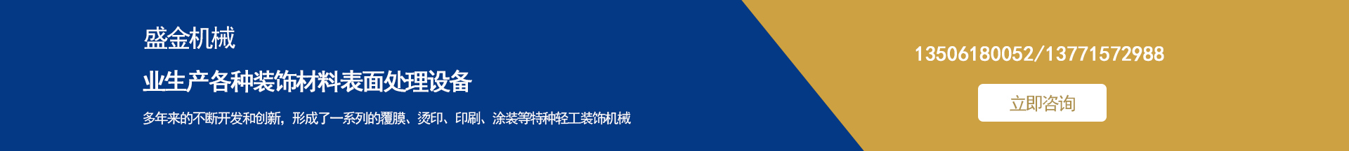 盛金機(jī)械專(zhuān)業(yè)生產(chǎn)各種裝飾材料表面處理設(shè)備 集多年來(lái)的不斷開(kāi)發(fā)和創(chuàng)新,形成了一系列的覆膜、燙印、印刷、涂裝等特種輕工裝飾機(jī)械。并敢于和善于開(kāi)發(fā)用戶急需的特殊要求機(jī)械設(shè)備。
